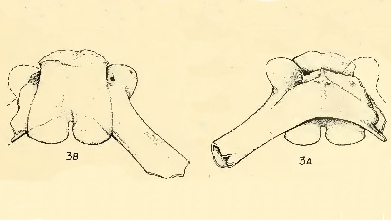 Plate 14, Figure 3 of  the original description (Taylor, 1942). A sacral vertebra with the diapophyses partially broken away near the base of Lithobates rexroadensis, Holotype KUVP 6369, (A) dorsal view, (B) ventral view.