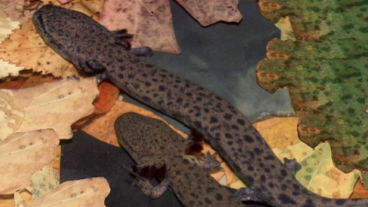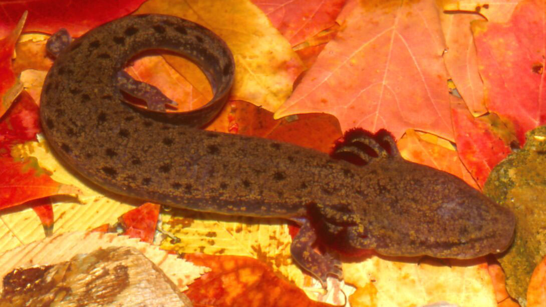 The Mudpuppy is a large, obligate aquatic salamander with a large flattened, square head, small eyes, and a pair of distinctive, red feathery gills on each side of its head. Mudpuppies are characterized by large size, the presence of bushy gills on each side of the neck behind the head, and four toes on each foot. The large, distinctive, bushy gills of these species are reddish or maroon; the head, body, limbs, and tail are yellowish brown, reddish, gray, or brown. The body and tail are covered with indistinct blue-black spots which vary in number. The belly is pale gray and may or may not be spotted.Adult males can be distinguished from females during the breeding season by the presence of a swollen ridge around, and crescent shaped groove just behind, the cloaca! opening. They are neotenic (retaining larval characteristics into maturity [no transformation]) and retain large external gills throughout their life. In the more clear and cool streams (e.g. Shoal Creek), their gills may be reduced, but are still quite noticeable.