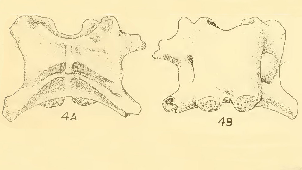 Plate 15, Figure 4, from the original description (Taylor, 1942). The sacrum of Anchylorana dubita Holotype, KUVP 6377; (A) dorsal view, (B) ventral view.