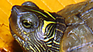 The range of head markings on the False Map Turtle (G. pseudogeographica) is quite variable. Typically, they have a prominent (yet thin) yellow line behind each eye on the top of the head. The inside of each line tapers toward the mid-line of the head and turns toward the neck. In many specimens, the bar behind the eye will form a thin crescent around the back of the eye on the side of the head.