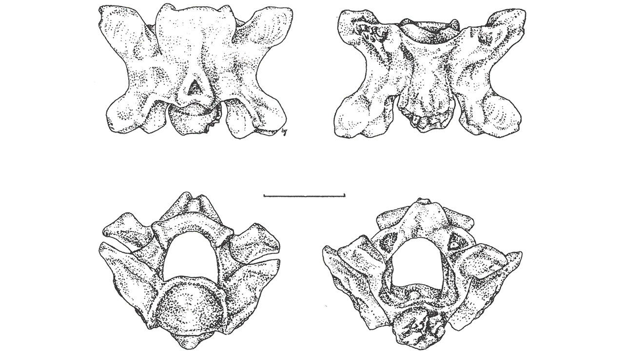 Vertebrae of Tregophis brevirachis in dorsal view: (A) UNSM 100256, (B) UNSM 100254. Scale bars = 2 mm. From Parmley and Hunter (2010).