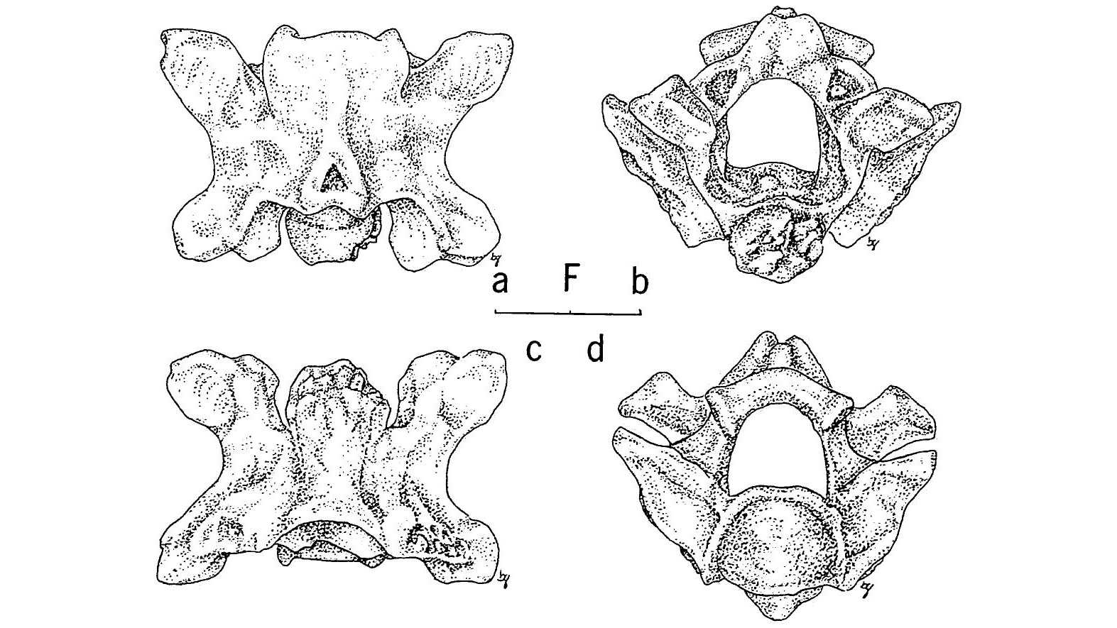Holotype lumbar vertebra of Tregophis braevirachis MSU-W 783. Figure F from Holman (1975): (a) dorsal view, (b) posterior view, (c) ventral view, (d) anterior view.