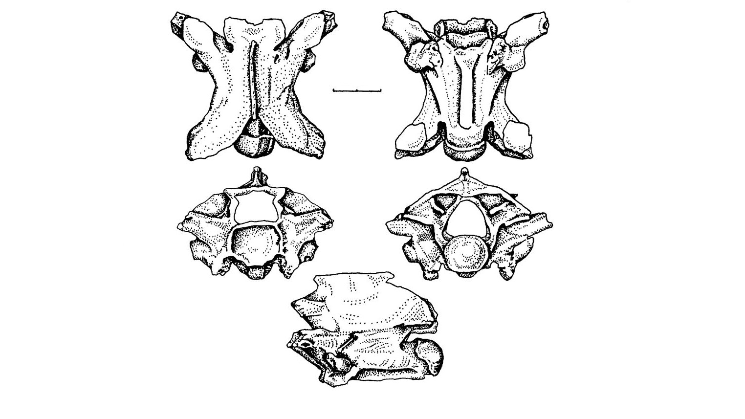 Figure 1 of the original description of Texophis wilsoni (Holman, 1984). Holotype trunk vertebra of Texasophis wilsoni (FHSMVP 3640). Top left dorsal view; top right ventral view;