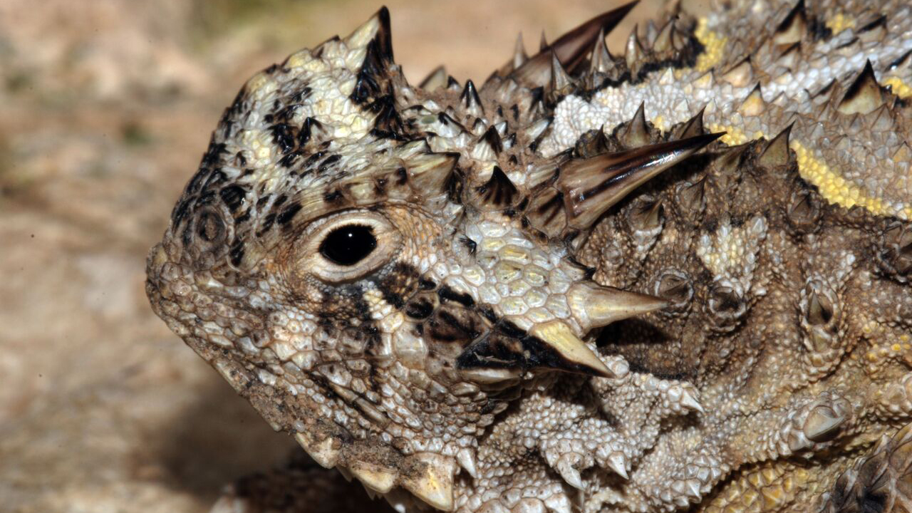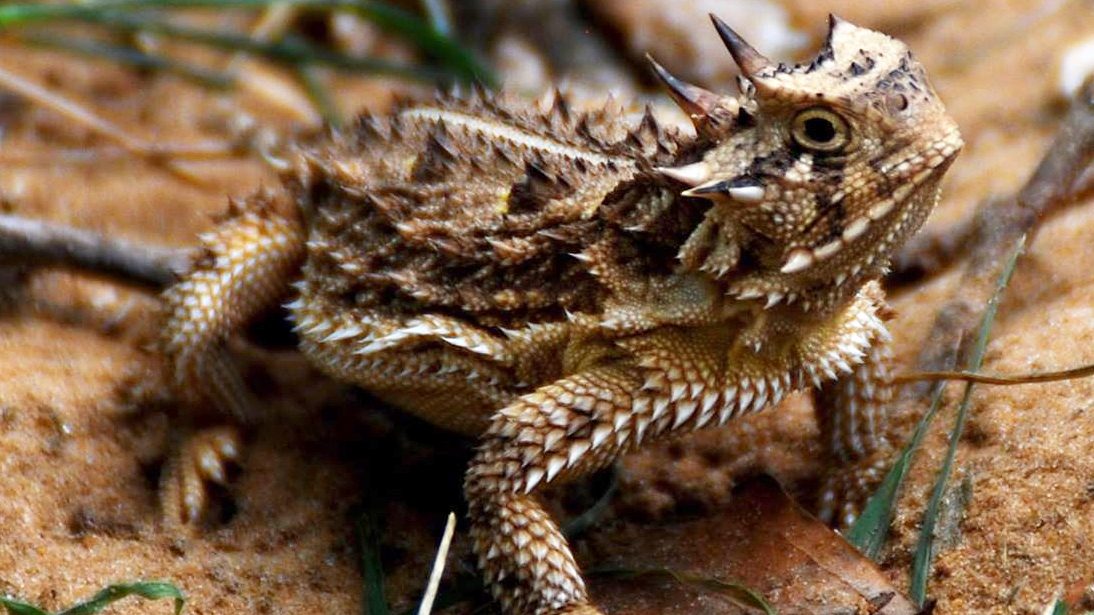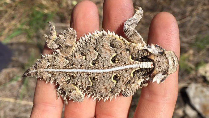 HARMLESSLY TOXUNGENIC: The Texas Horned Lizard is distinctive. The harmless so-called “horny toad” is flat-bodied yet formidable in appearance. The Texas Horned Lizard is characterized by four limbs, an ear opening on each side of the head, extremely rough, raised scales on its body, and large spines projecting out from the back of the head. The general color of this lizard ranges from yellowish brown to reddish brown. There is a dark brown blotch on each side of the neck and a series of dark spots on each side of the back separated by a yellow or white line. The belly is white with a few small gray spots. External sexual differences are few, but females grow slightly larger than males.